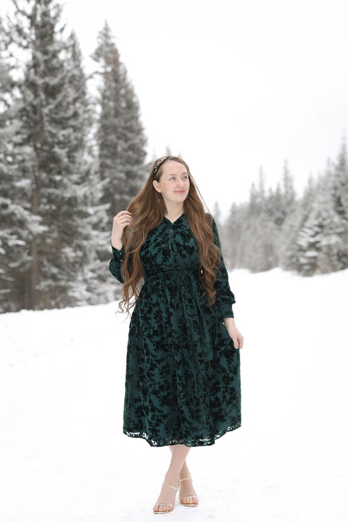 Not your average velvet dress - this gorgeous dress is full of beautiful details from head to hem! A velvet floral overlay adds texture and catches the light ever so perfectly. Get ready for a flood of compliments - ladies everywhere will be asking where you found such a unique dress! Beautiful for family photos, holiday parties, weddings and more! Modest wrap style. Nursing friendly snap at bodice.