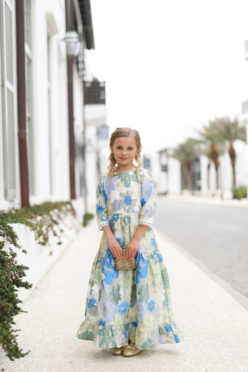 Does this dress look familiar? We have fallen head over heels in LOVE with this style and fabric and we can't help but bring it back in a gorgeous new color palette that is perfect for summer! This fabric is bursting with oversized flowers in green and blue hues. Look a little closer and you will see gold metallic thread throughout for a hint of shimmer. A tea length skirt that has gorgeous movement with each step - this dress is a stunner! Made for weddings, garden parties, banquets, special photos - anytime your little lady want to look and feel her best! Back zipper. Also available for women.