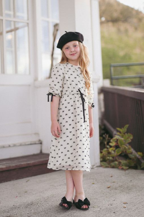 The most darling dress from our Classic in Black Collection! We can't get enough of this sweet bow print! If your little lady wants to keep the look chic and simple, she can style it with black accessories. But if you're going to a holiday event, this dress would be darling with a red beret or shoes! She can easily wear this dress throughout Autumn and Winter - it will quickly become one of her favorites! Darling for family photos, Sunday best, holiday parties and more.