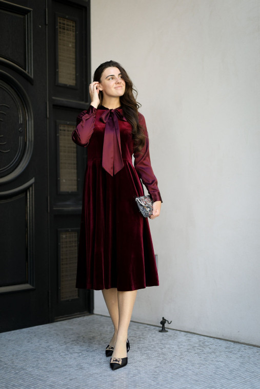 We first released this timeless style in classic black, A Time in Twilight Dress, and we wanted to bring it back in a festive color fit for the holiday season. This deep, rich burgundy is a dream! The perfect color for the winter and holiday season. All the same details you know and love - timeless, feminine fit, soft velvet, satin sleeves and the perfect bow to complete the look! The perfect choice for family photos, Christmas dinner, Sunday best & more!