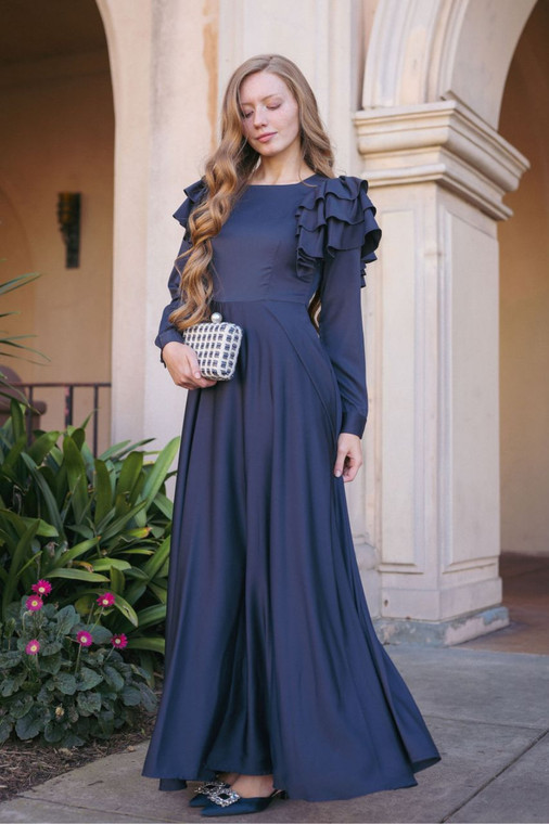 Rightfully named the Madame Monet dress, this dress is like a Monet painting come to life! Delicate, feminine details and a soft color that looks lovely on all complexions. Sophisticated satin-like fabric that was made for special occasions. A flattering, feminine A-line skirt that flows beautifully and creates for a stunning twirl (test it out for yourself!). And last but certainly not least - the stunning ruffle sleeves complete this unique look and make it stand out in a crowd. A beautiful choice for weddings, special photos, banquets - anytime you want to take a step back in time!