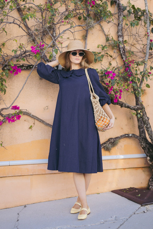 The name says it all, this is the most darling denim dress we ever did design! Simple but so sweet with the Peter Pan collar and ruffle trim detail. The perfect dark wash that works for all seasons. A flattering fit for ladies of every age and stage of life. Just as adorable with sneakers and sunnies as it is with boots and a beret. This will easily be in your regular rotation!