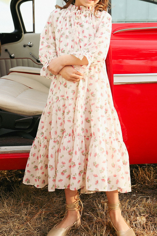 Cottage core girlies - this dress is for you! This dress has so many darling details! A whimsical floral print, tiered skirt, ruffle sleeves & collar for a vintage-inspired look. It's adorable for all things Summer! Style it with a denim jacket and slides for a casual but cute ice cream outing or dress shoes and hair bow for an evening out with the family - the possibilities are endless!