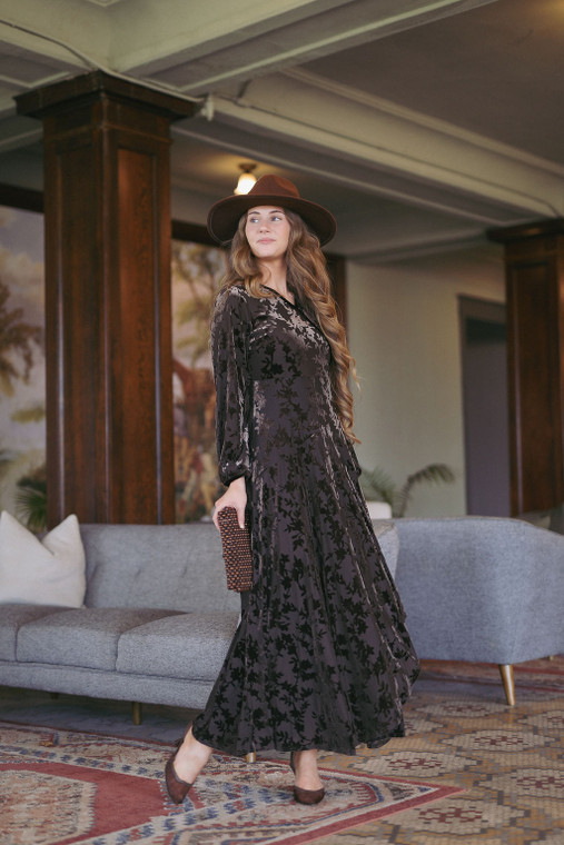 This dress will take you from Autumn to Winter in style! A beautiful transition dress with moody Earth tones that you will love. A flattering faux wrap style with a modern asymmetrical ruffle along the skirt. A lovely choice for Sunday best, dinner dates, Christmas and holiday parties, family photos & more.